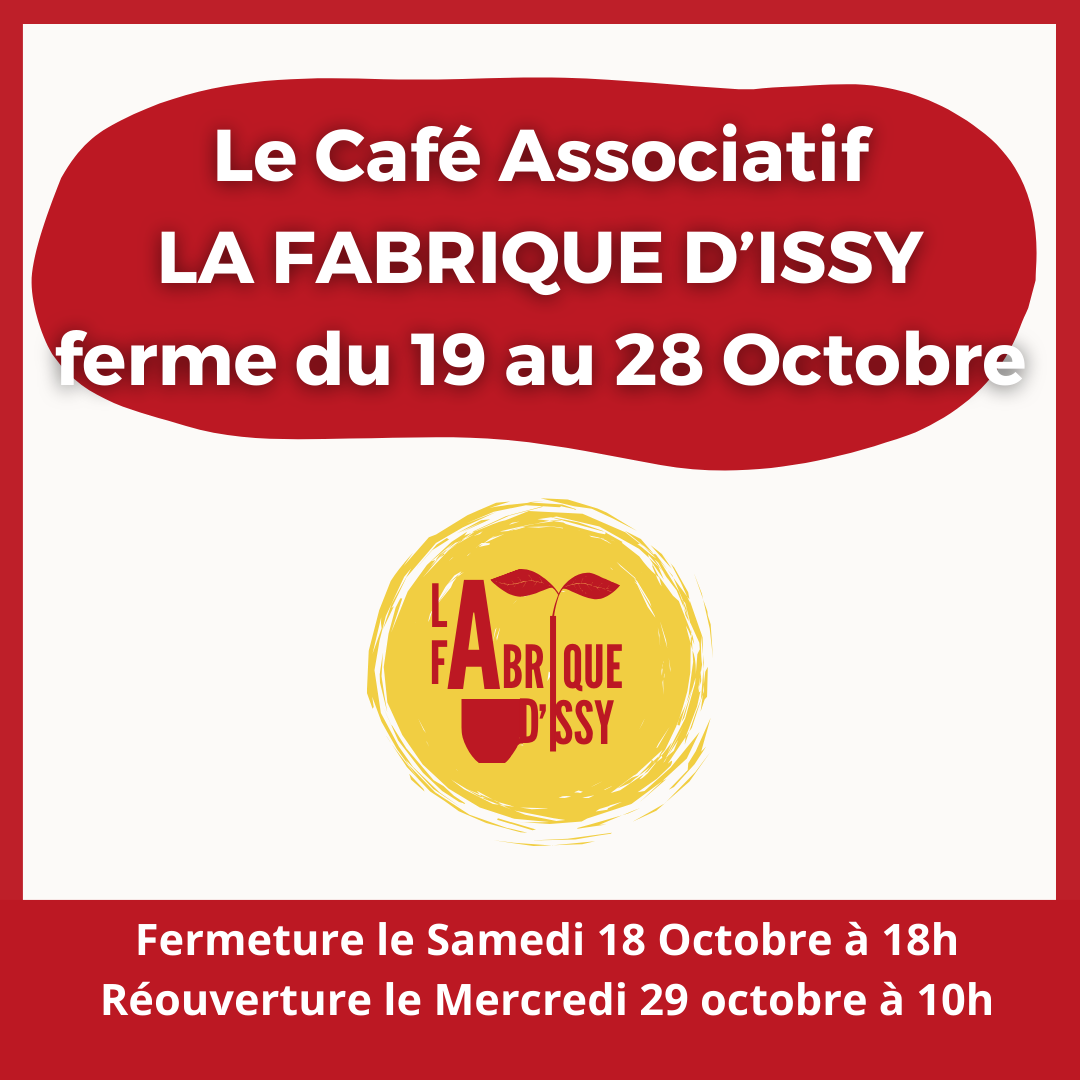 La Fabrique d'Issy La Fabrique d'Issy, 54 Rue d'Erevan, Issy-Les-Moulineaux, FranceVoici le calendrier des activités d'Octobre Le café associatif est ouvert du Mercredi au samedi 10h-18h Rdv sur eventbrit pour réserver vos places : https://www.eventbrite.fr/o/ecolau-la-fabrique-dissy-55197656713