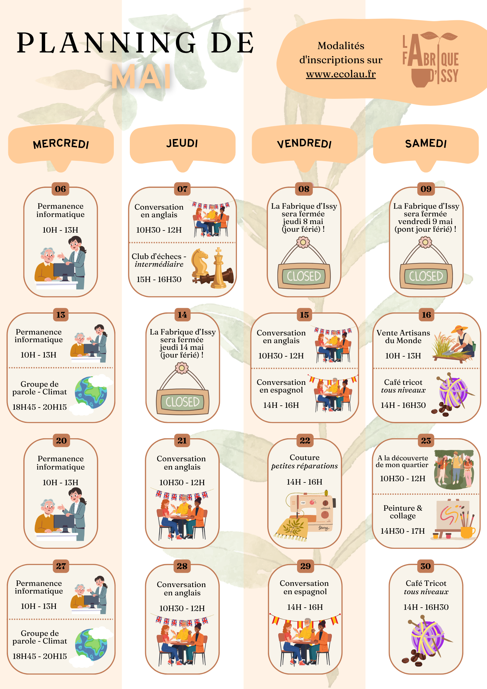 Voici le planning des activités du mois de mai Le café associatif est ouvert du mercredi au samedi de 10h à 18h ! Rdv sur Eventbrite pour réserver vos places : https://www.eventbrite.fr/o/ecolau-la-fabrique-dissy-55197656713
