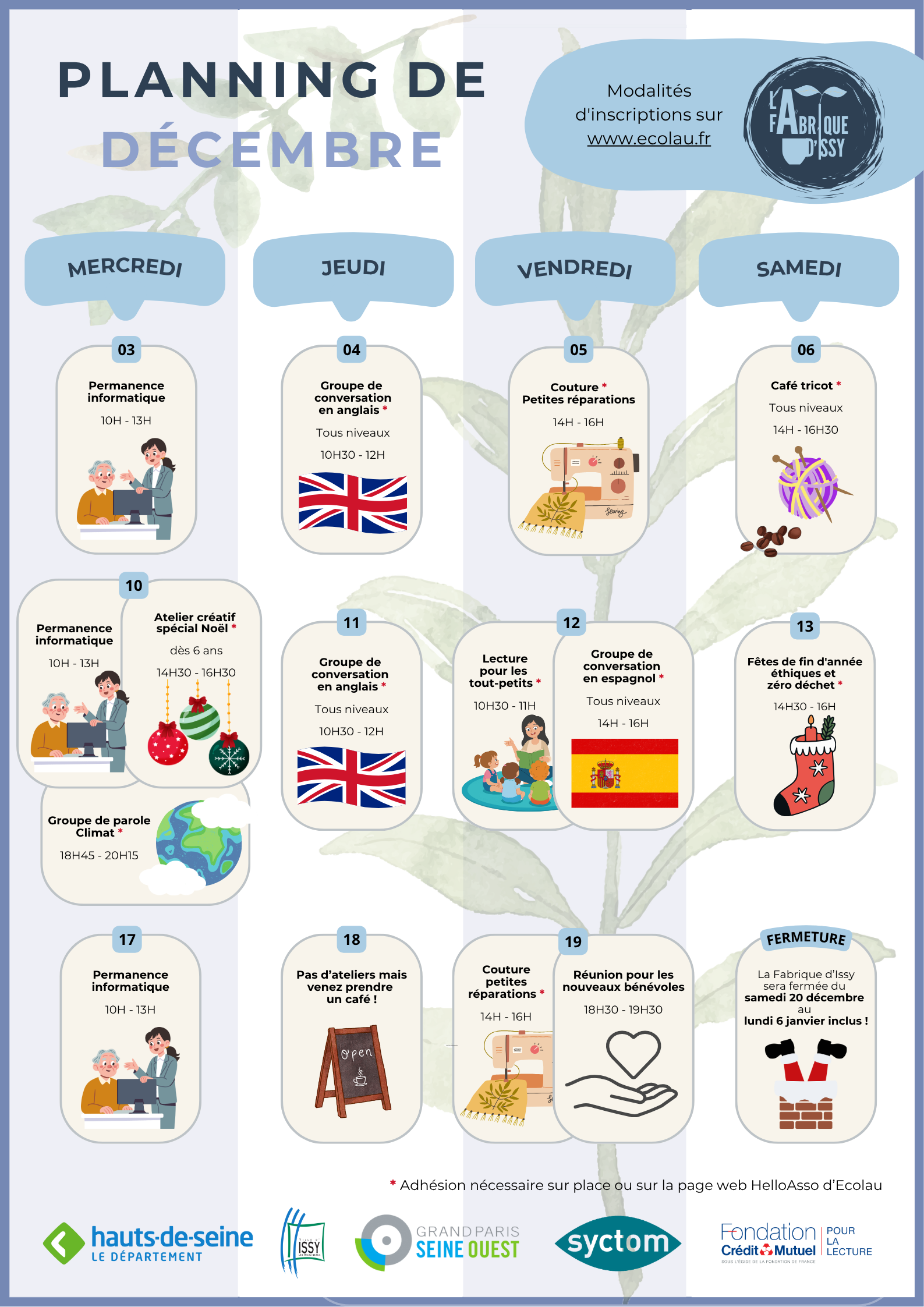 Voici le calendrier des activités du mois de décembre Le café associatif est ouvert du Mercredi au samedi 10h-18h Rdv sur eventbrite pour réserver vos places : https://www.eventbrite.fr/o/ecolau-la-fabrique-dissy-55197656713
