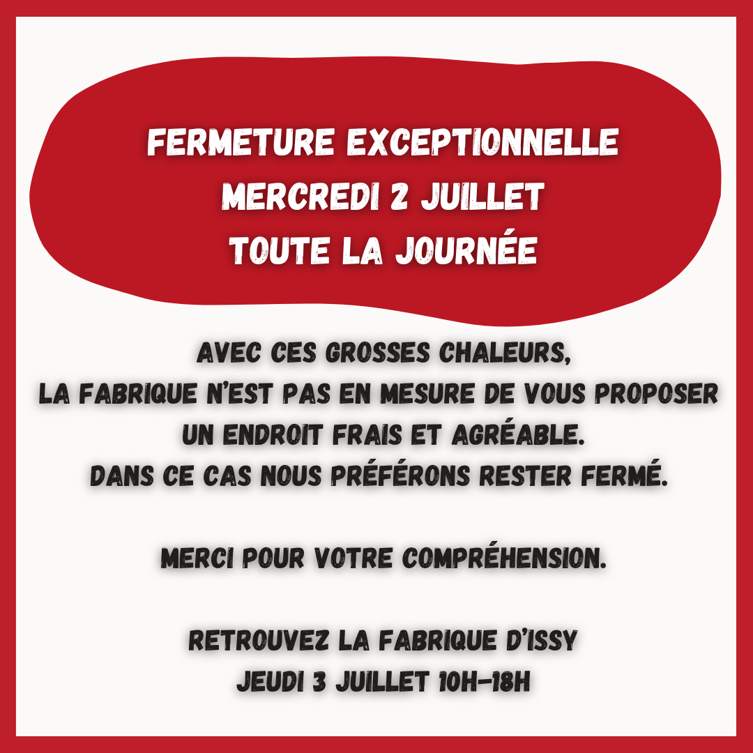 FERMETURE EXCEPTIONNELLE CE MERCREDI 2 JUILLET 6 JUIN TOUTE LA JOURNEE pour cause de grosse chaleur. Retrouvez nous jeudi 3 juillet à 10h !
