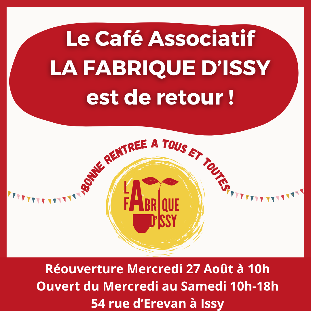 La Fabrique d'Issy fermera en août. A partir du Samedi 19 Juillet 18h il ne sera plus possible de nous déposer des dons car nous ne pourrons pas gérer de stock pendant la fermeture Passez cette semaine et ensuite retrouvez … Lire la suite
