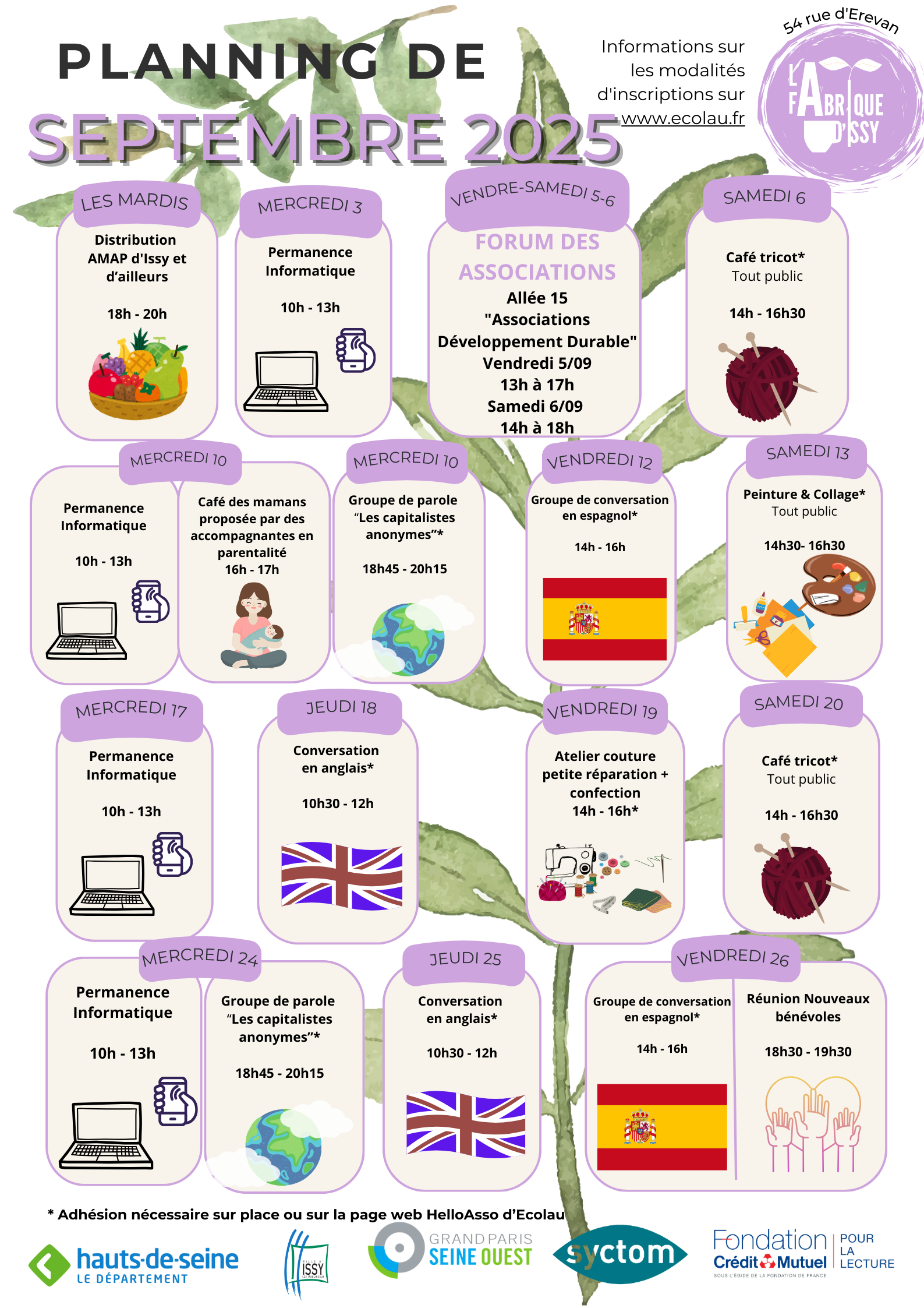 Voici le calendrier des activités de Septembre Le café associatif est ouvert du Mercredi au samedi 10h-18h Rdv sur eventbrit pour réserver vos places : https://www.eventbrite.fr/o/ecolau-la-fabrique-dissy-55197656713